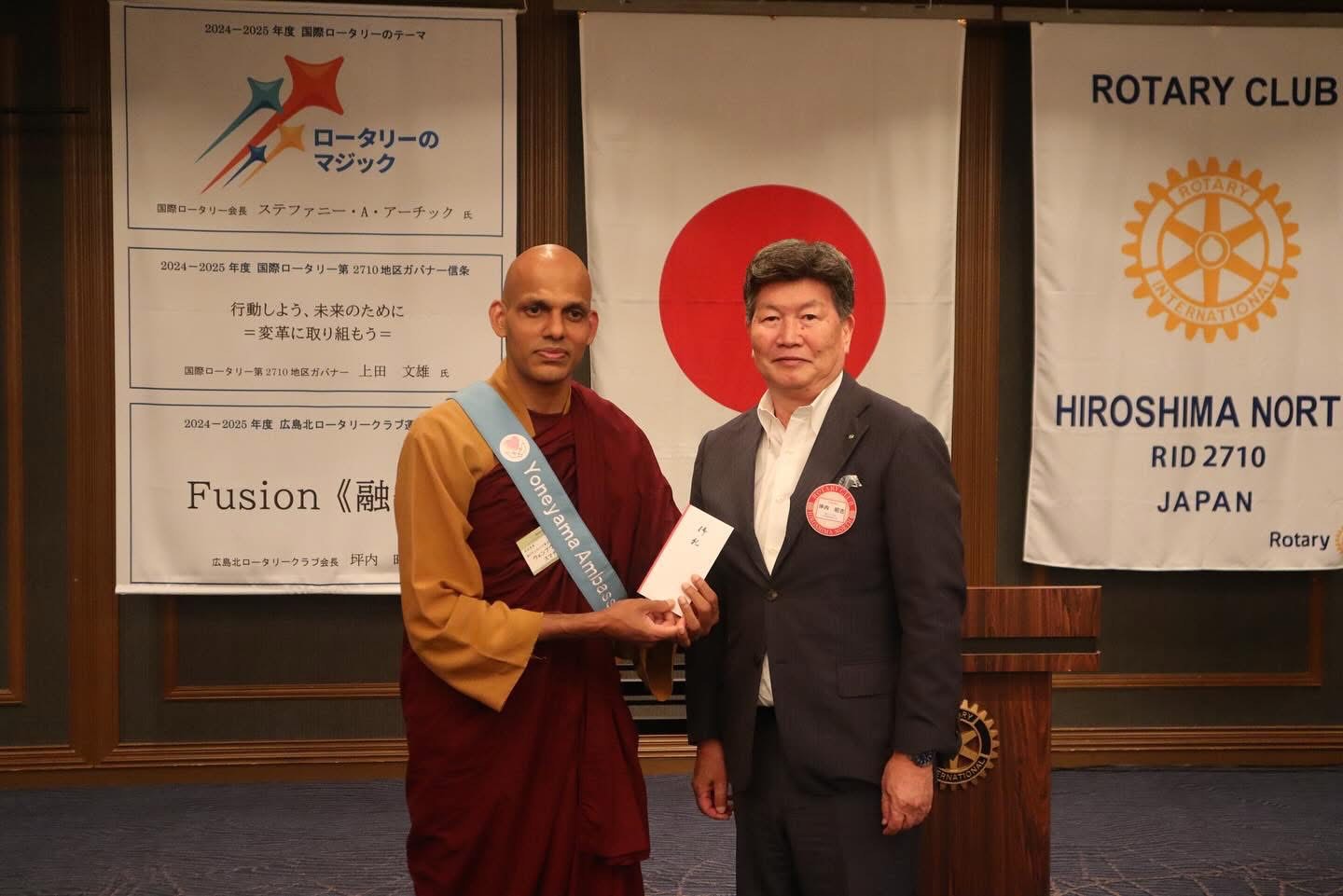 よねやま親善大使のウェンブウェべ・スマナサラ様、本日はようこそ我が広島北RCにお越し下さいました。この後の卓話にて、子供の教育と国際平和についてお話して下さるという事で、非常に興味深く楽しみと同時に、平和について改めて私達も考える機会になると思っております。どうぞ宜しくお願い致します。